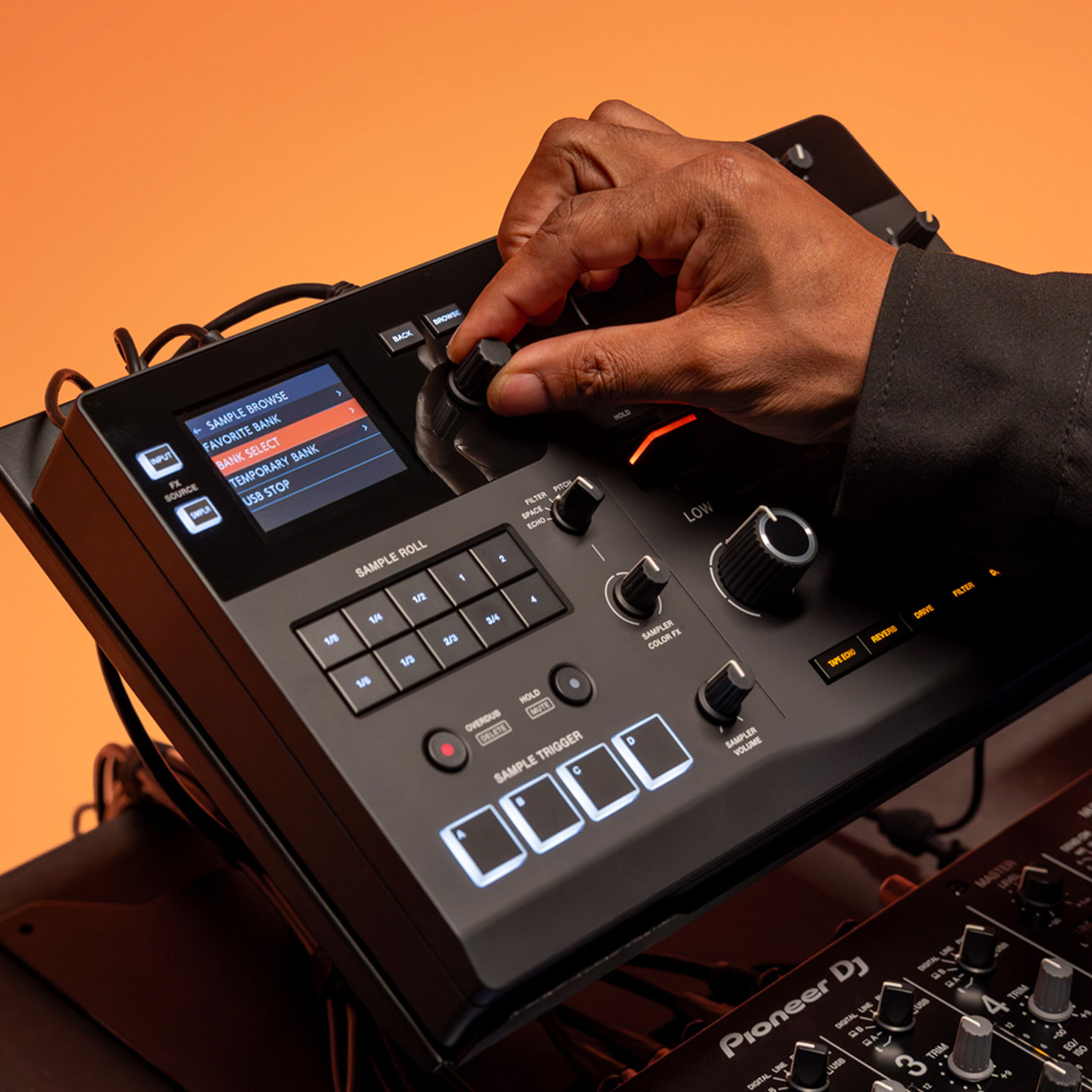 La pantalla multicolor le permite consultar detalles clave como subparámetros 3-Band FX, samples cargados, Sampler Color FXseleccionado, BPM, y niveles de entrada/salida. También puede explorar y seleccionar rápidamente samples directamente desde la pantalla, lo que le permite manejar el dispositivo con confianza y concentrarse plenamente en su actuación.