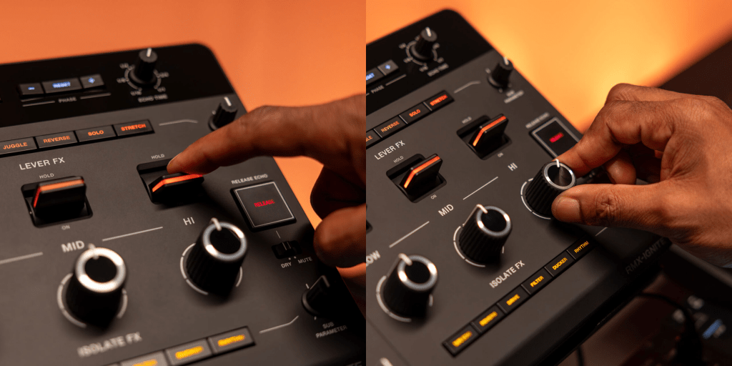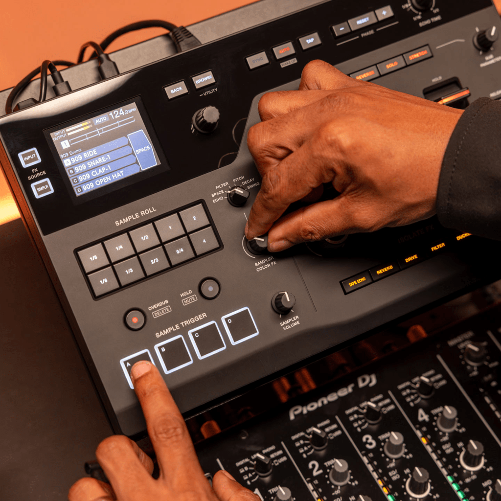 - Isolate FX: 3 mandos grandes permiten un control suave y dinámico. Los efectos disponibles incluyen Tape Echo, Reverb, Drive, Filter, Ducker, y Rhythm.